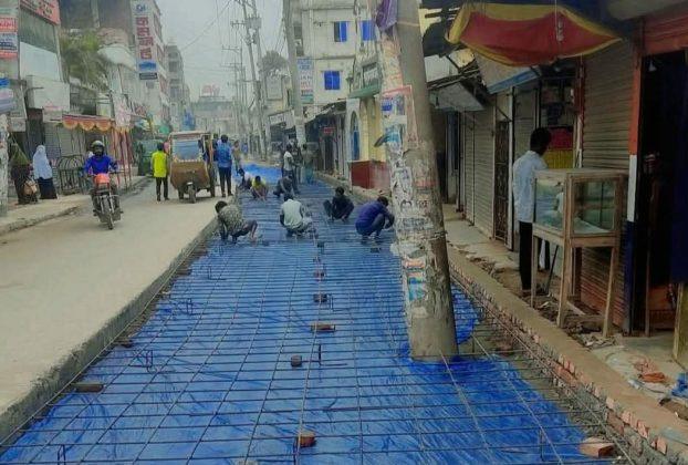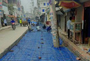 সড়কে বিদ্যুতের খুঁটি রেখেই চলছে ঢালাইয়ের কাজ