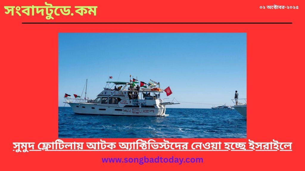 শেয়ার করুন….,সুমুদ ফ্লোটিলায় আটক অ্যাক্টিভিস্টদের নেওয়া হচ্ছে ইসরাইলে অবরুদ্ধ গাজা উপত্যকামুখী বৈশ্বিক ত্রাণের নৌবহর ফ্লোটিলার আটক মানবাধিকার কর্মীদের ইউরোপে ফেরত পাঠানো হবে বলে জানিয়েছে ইসরায়েল। বৃহস্পতিবার ইসরায়েলের সামরিক বাহিনীর এক বিবৃতিতে এই তথ্য জানানো হয়েছে। প্রায় ৪৫টি জাহাজ নিয়ে গঠিত ‘গ্লোবাল সুমুদ ফ্লোটিলা’ নৌবহর গত মাসে স্পেন থেকে গাজার উদ্দেশ্যে যাত্রা শুরু করে। এতে … Continue reading সুমুদ ফ্লোটিলায় আটক অ্যাক্টিভিস্টদের নেওয়া হচ্ছে ইসরাইলে