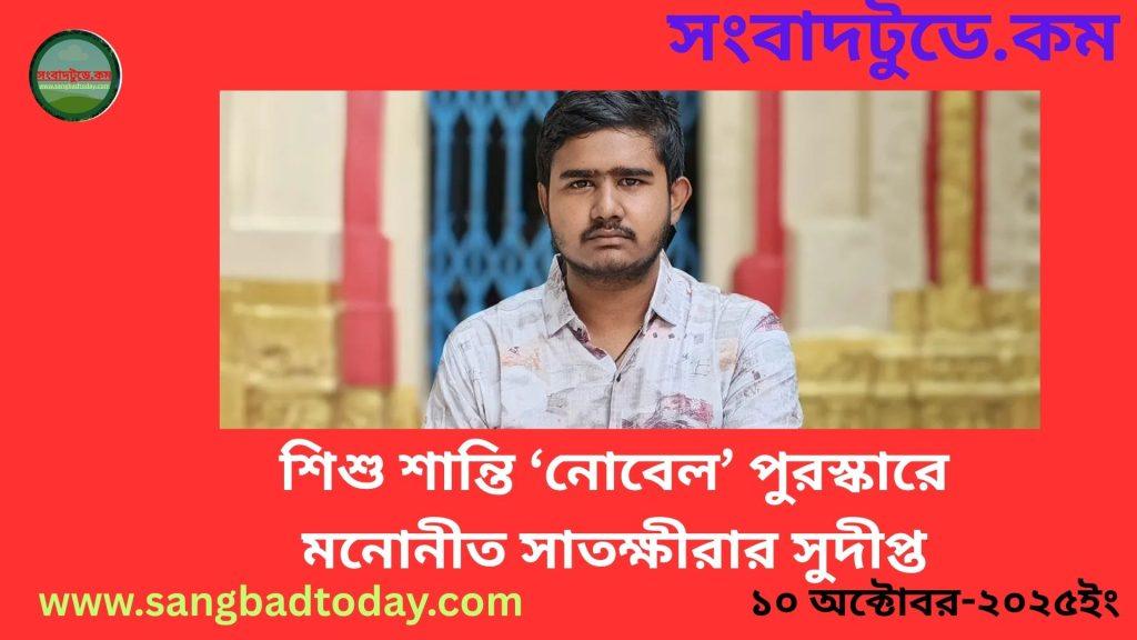 শেয়ার করুন….,শিশু শান্তি ‘নোবেল’ পুরস্কারে মনোনীত সাতক্ষীরার সুদীপ্ত শিশু সুরক্ষা, জলবায়ু, ন্যায়বিচার ও শিক্ষার প্রসারে কাজের স্বীকৃতিস্বরূপ শিশুদের ‘নোবেল’ আন্তর্জাতিক শিশু শান্তি পুরস্কার–২০২৫ এর জন্য মনোনীত হয়েছেন সাতক্ষীরার তরুণ সমাজকর্মী সুদীপ্ত দেবনাথ (১৫)। সুদীপ্ত দেবনাথ সাতক্ষীরা সরকারি উচ্চ বিদ্যালয় থেকে ২০২৫ সালে এসএসসি পাস করে বর্তমানে সাতক্ষীরা সরকারি কলেজে একাদশ শ্রেণিতে অধ্যয়ন করছেন। তিনি শহরের … Continue reading শিশু শান্তি ‘নোবেল’ পুরস্কারে মনোনীত সাতক্ষীরার সুদীপ্ত