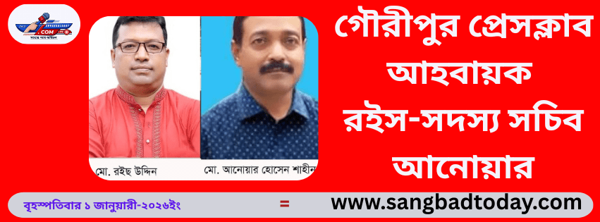 গৌরীপুর প্রেসক্লাব আহবায়ক রইস-সদস্য সচিব আনোয়ার মোঃ হুমায়ুন কবির, গৌরীপুরঃ ময়মনসিংহের গৌরীপুর প্রেসক্লাবে ৪ সদস্যবিশিষ্ট আহ্বায়ক কমিটি গঠন করা হয়েছে। বুধবার (১ জানুয়ারি ২০২৬) বিকাল ৪টায় গৌরীপুর প্রেসক্লাব মিলনায়তনে আয়োজিত বার্ষিক সভায় সর্বসম্মতিক্রমে এ কমিটি গঠন করা হয়। সভায় সভাপতিত্ব করেন গৌরীপুর প্রেসক্লাবের সভাপতি কাজী আব্দুল্লাহ আল আমিন। সভায় প্রথমে বার্ষিক প্রতিবেদন উপস্থাপন করেন প্রেসক্লাবের […]