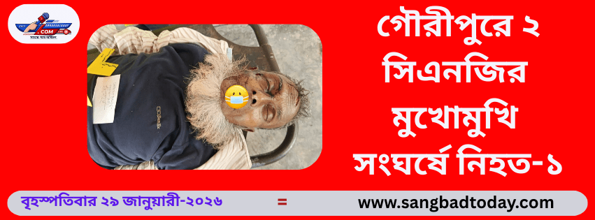 গৌরীপুরে ২ সিএনজির মুখোমুখি সংঘর্ষে নিহত-১ মোঃ হুমায়ুন কবির, গৌরীপুরঃ ময়মনসিংহের গৌরীপুরে ময়মনসিংহ–কিশোরগঞ্জ মহাসড়কে দুটি সিএনজির মুখোমুখি সংঘর্ষে একজন নিহত এবং অন্তত চারজন আহত হয়েছেন। বৃহস্পতিবার (২৯ জানুয়ারী এ দুর্ঘটনা ঘটে। দুর্ঘটনাস্থলটি গৌরীপুর উপজেলার ডৌহাখলা ইউনিয়নের চরশ্রীরামপুর এলাকায়, মেসার্স তাসনিম ফিলিং স্টেশনের পশ্চিম পাশে অবস্থিত। স্থানীয় সূত্রে জানা যায়, ময়মনসিংহ থেকে আসা একটি সিএনজির সঙ্গে গৌরীপুর […]