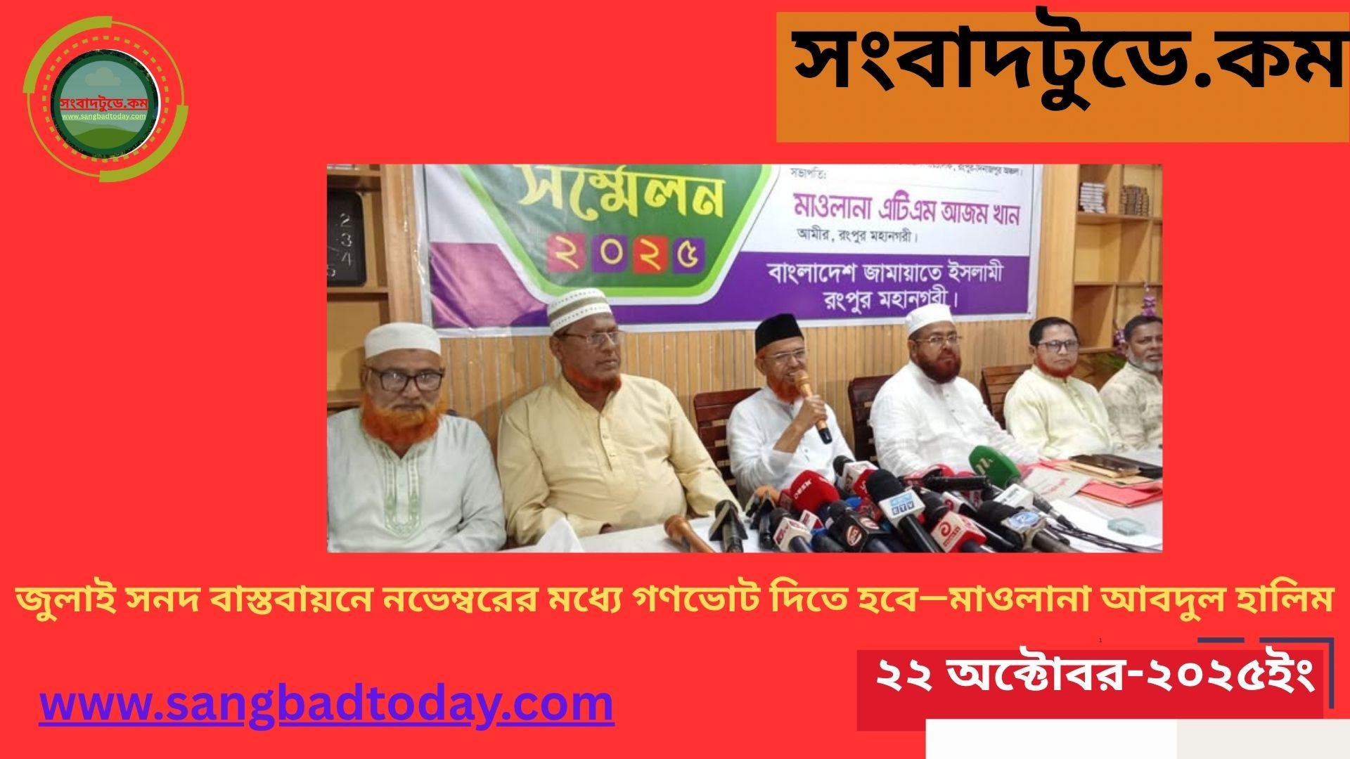 বাংলাদেশ জামায়াতে ইসলামীর সহকারী সেক্রেটারি জেনারেল ও রংপুর-দিনাজপুর অঞ্চলের পরিচালক মাওলানা আবদুল হালিম বলেছেন, অবিলম্বে জুলাই জাতীয় সনদ বাস্তবায়ন আদেশ জারি এবং এ বিষয়ে নভেম্বরের মধ্যে গণভোট দিতে হবে।