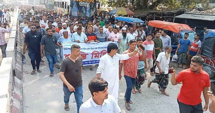 করমজা চতুর বাজার বনিক সমবায় সমিতি লিঃ ও সিএন্ডবি বাসস্ট্যান্ড বাজার ব্যবস্থাপনা কমিটির যৌথ উদ্যোগে বিভিন্ন দোকানপাট ভাংচুর, সন্ত্রাসী কার্যকলাপ ও চাঁদাবাজি নিরসনের লক্ষ্যে ব্যবসায়ী ও সাধারণ লোকজন নিয়ে শান্তি পূর্ণ মিছিল শেষে সংক্ষিপ্ত আলোচনা সভায় বক্তব্য দেন চতুর বাজার বনিক সমবায় সমিতি লিঃ এর সভাপতি আনোয়ার হোসেন মহরম। সাহ- সভাপতি, আনোয়ার হোসেন মুনু।