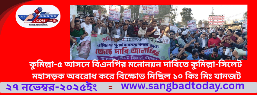 কুমিল্লা-৫ আসনে বিএনপির মনোনয়ন দাবিতে কুমিল্লা-সিলেট মহাসড়ক অবরোধ করে বি ক্ষোভ মিছিল ১০ কিঃ মিঃ যানজট