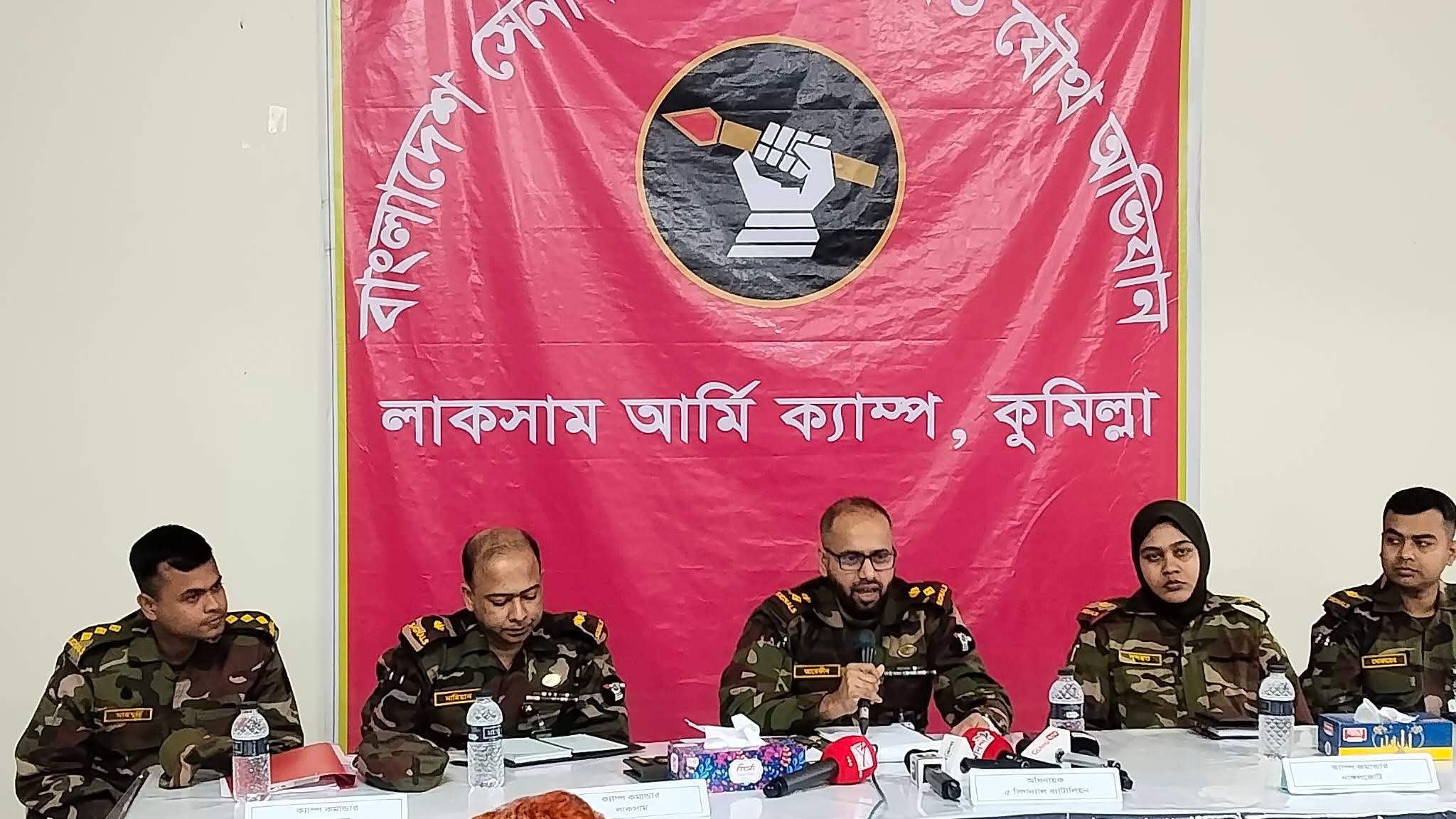 সাংবাদিকদের সাথে মতবিনিময় সভায় বক্তব্য রাখেন লেফটেন্যান্ট কর্নেল শামছুল আরেফিন, মেজর ফাহিম আল নাহিয়ান, মেজর নুফায়ের ও মেজর নুসরাত কবির।